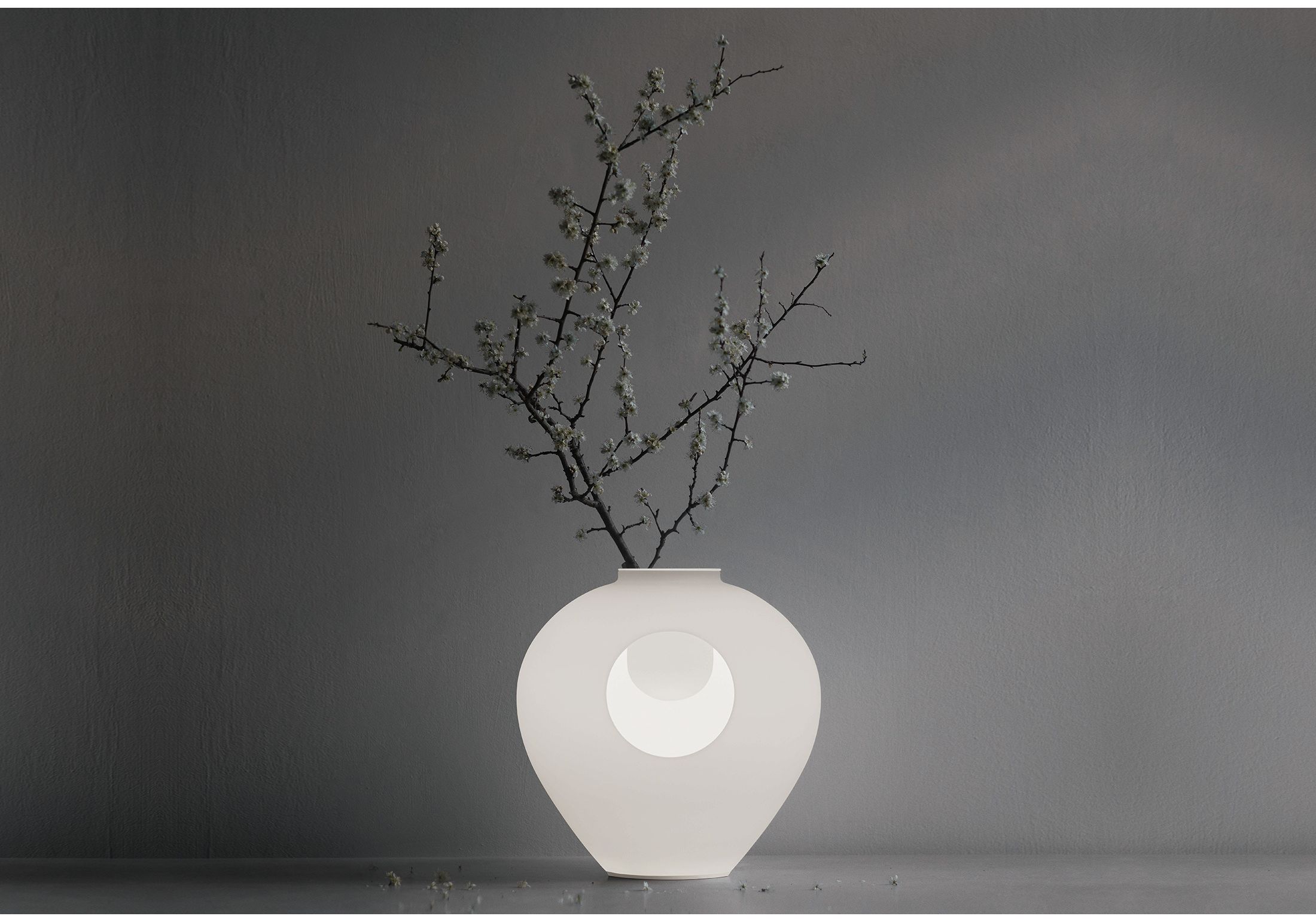 Эта лампа из матового стекла служит в качестве вазы, но в нее встроен теплостойкий слой, предотвращающий высыхание цветов. Отверстие в его центре позволяет свету отражаться даже при выключенной лампе.