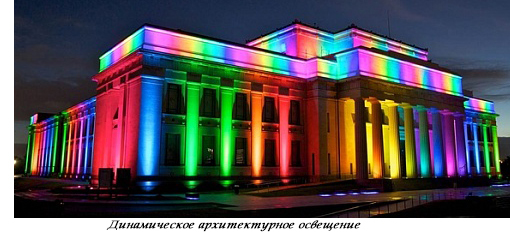 Данный метод заключается в смене цвета и света с течением определенного времени. Это «оживляет» образ здания, привлекает большое внимание и подчеркивает его выразительность.