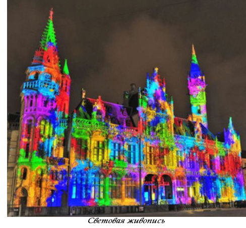 Это уже не само освещение, как таковое, а больше уже рекламное или информационное освещение. Оно представляет собой неподвижные или динамические световые живописные проекции. Используется для концертных залов, развлекательных заведений, торговых центров и спортивных сооружений.