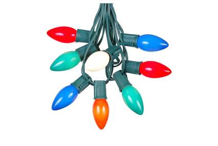 Этот стиль новогоднего света напоминает 50-е годы и отлично подходит, если вы хотите придать этому образу особый вид. Это 30-ти метровая нить, которая удобна, потому что она не может быть гирляндной. Тем не менее, каждая лампочка составляет семь ватт, так что вы получите яркий праздничный свет. Поставляется с 25 дополнительными лампочками, так как они довольно хрупкие и недолговечные. Вы можете выбрать классические многоцветные гирлянды или однотонные синего, зеленого, оранжевого, розового, фиолетового, красного, белого или желтого цветов. Отлично подходит для больших елок и для украшения помещений или уличных стен.