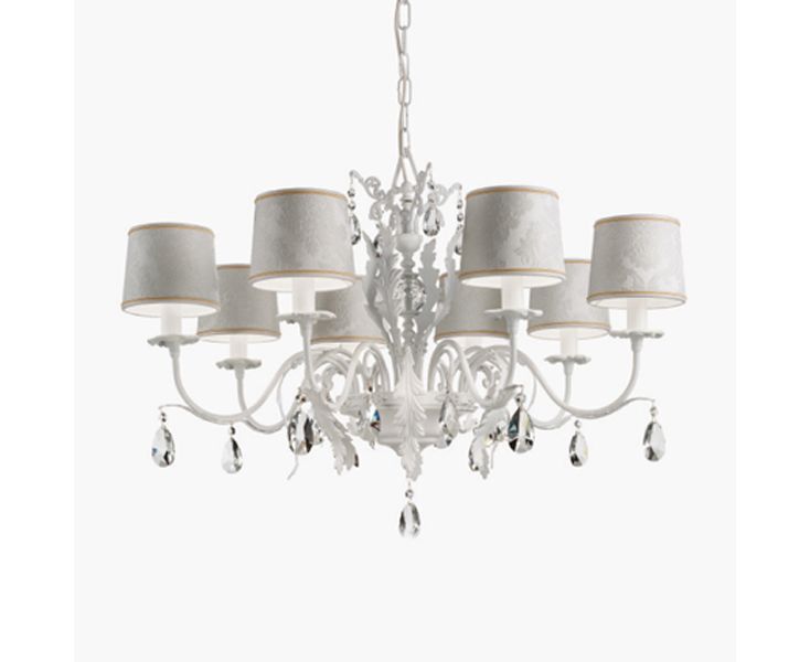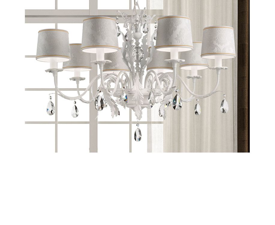 Металлический каркас с роскошной позолотой и богатыми элементами из сусального золота или в элегантной белой отделке. Абажуры с камчатным