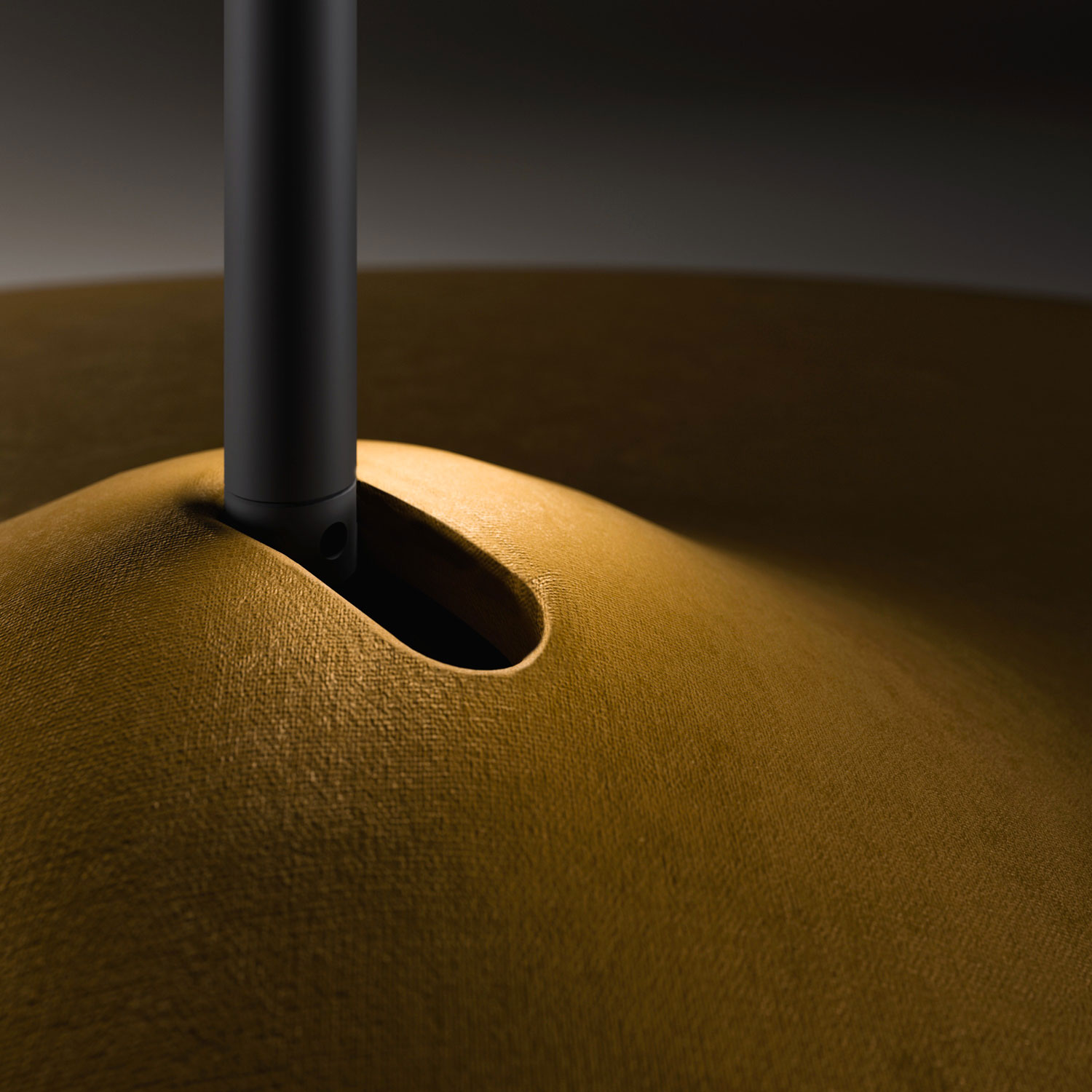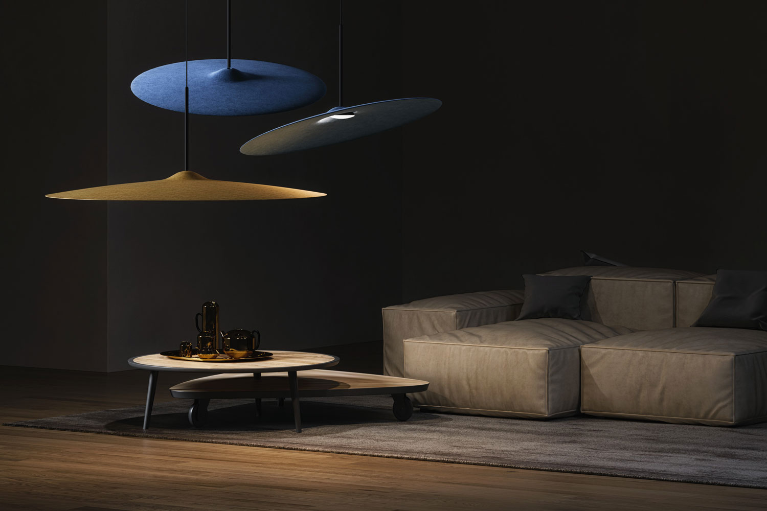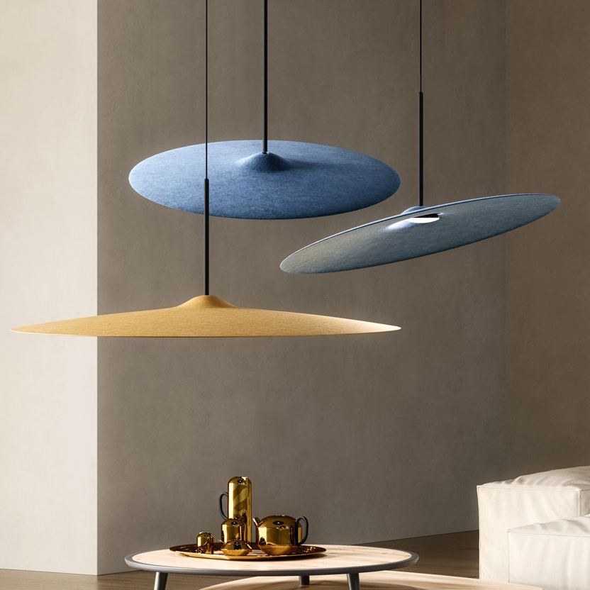 Acustica вдохновлена барабанной тарелкой, большой и тонкий абажур переворачивает ее концепцию, поглощая окружающий звук и создавая высокий уровень акустического комфорта.