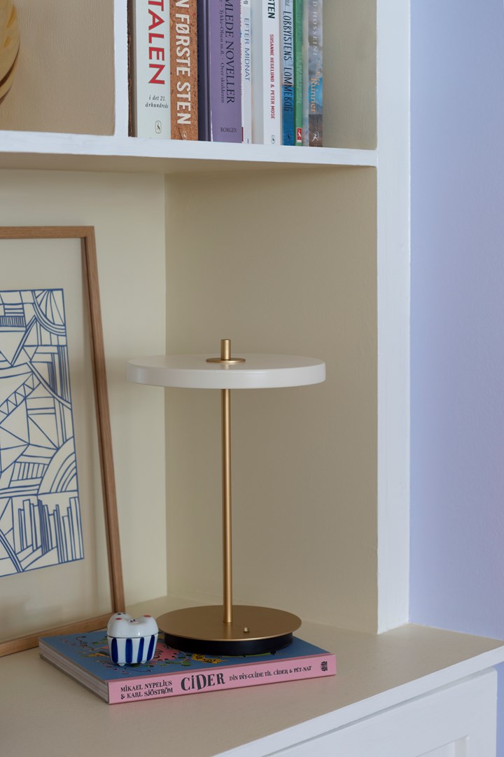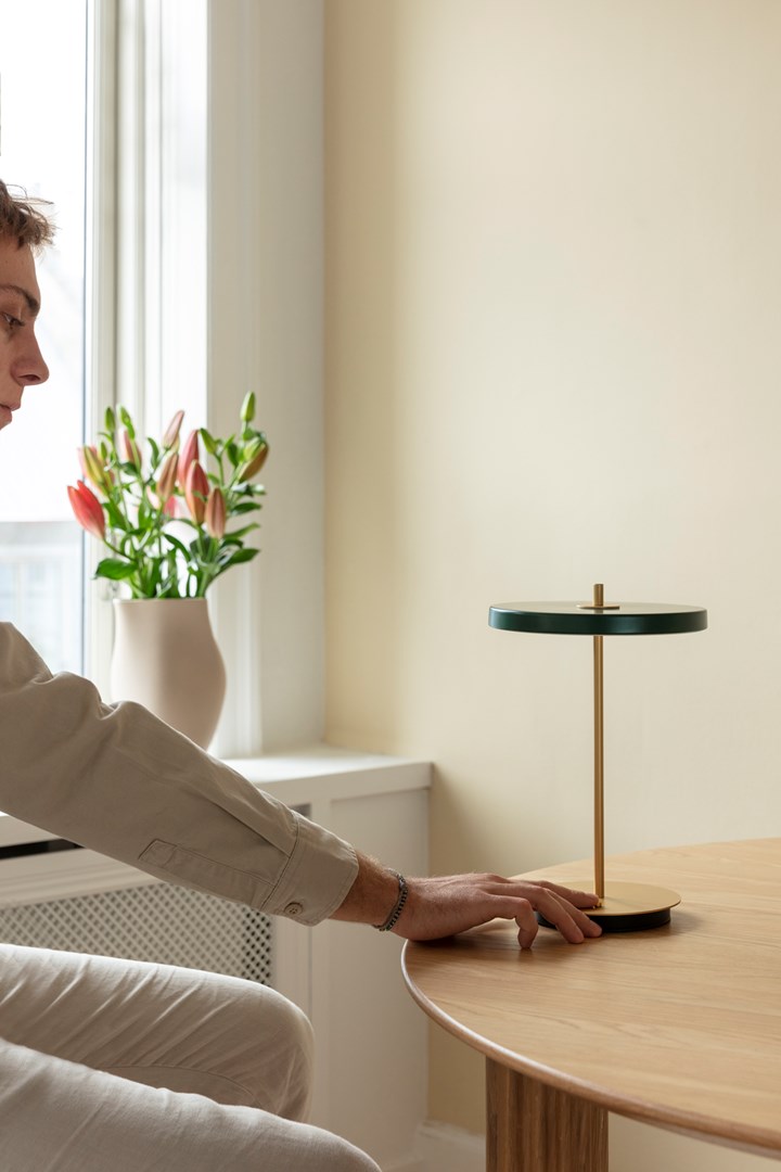 Asteria Move имеет три уровня интенсивности света, которые можно регулировать нажатием кнопки на цоколе лампы. Срок работы аккумулятора на одном заряде Asteria Move составляет до 35 часов, и его можно легко зарядить, поместив поверх любого зарядного устройства Qi, такого как UnifierTM из коллекции аксессуаров для освещения UMAGE, или с помощью входящего в комплект USB-кабеля.