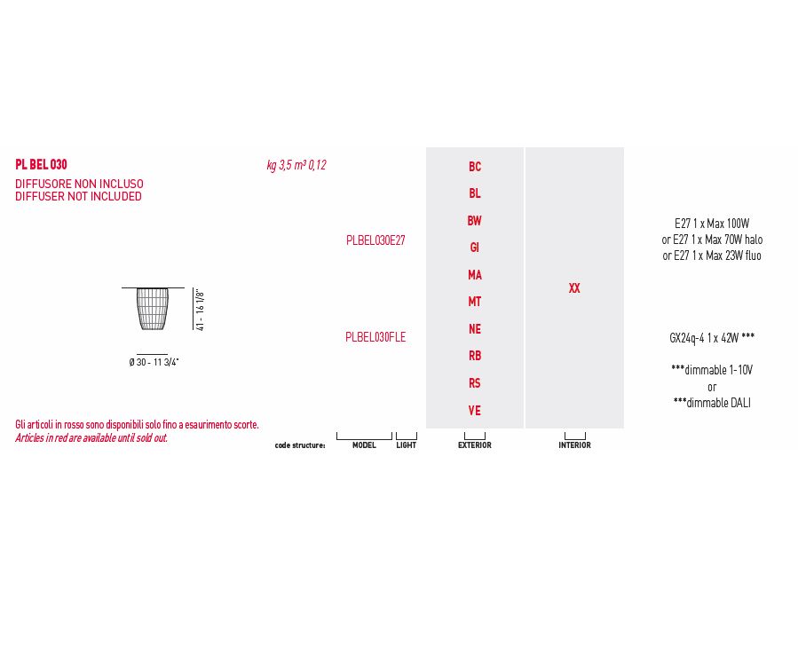 BC белый - PLBEL030E27BCXXBL электрический синий - PLBEL030E27BLXX BW теплый белый - PLBEL030E27BWXX GI золотой желтый - PLBEL030E27GIXX MA коричневый - PLBEL030E27MAXX MT кирпичный - PLBEL030E27MTXX NE черный - PLBEL030E27NEXX RB красный бордо - PLBEL030E27RBXX RS красный - PLBEL030E27RSXX VE зеленый - PLBEL030E27VEXX | BC белый - PLBEL030FLEBCXXBL электрический синий - PLBEL030FLEBLXX BW теплый белый - PLBEL030FLEBWXX GI золотой желтый - PLBEL030FLEGIXX MA коричневый - PLBEL030FLEMAXX MT кирпичный - PLBEL030FLEMTXX NE черный - PLBEL030FLENEXX RB красный бордо - PLBEL030FLERBXX RS красный - PLBEL030FLERSXX VE зеленый - PLBEL030FLEVEXX |