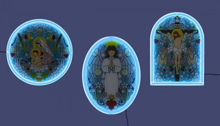 Вдохновленные витражами церквей - как в Италии, так и во фламандском контексте, в котором творили дизайнеры, - три настенных светильника сделаны из стекла и окружены светодиодным светом, похожим на ореол, который слегка подрывает образ представления священного. Типичная графика Studio Job превращает эти известные и усвоенные предметы в новые декорации для современного дома.
