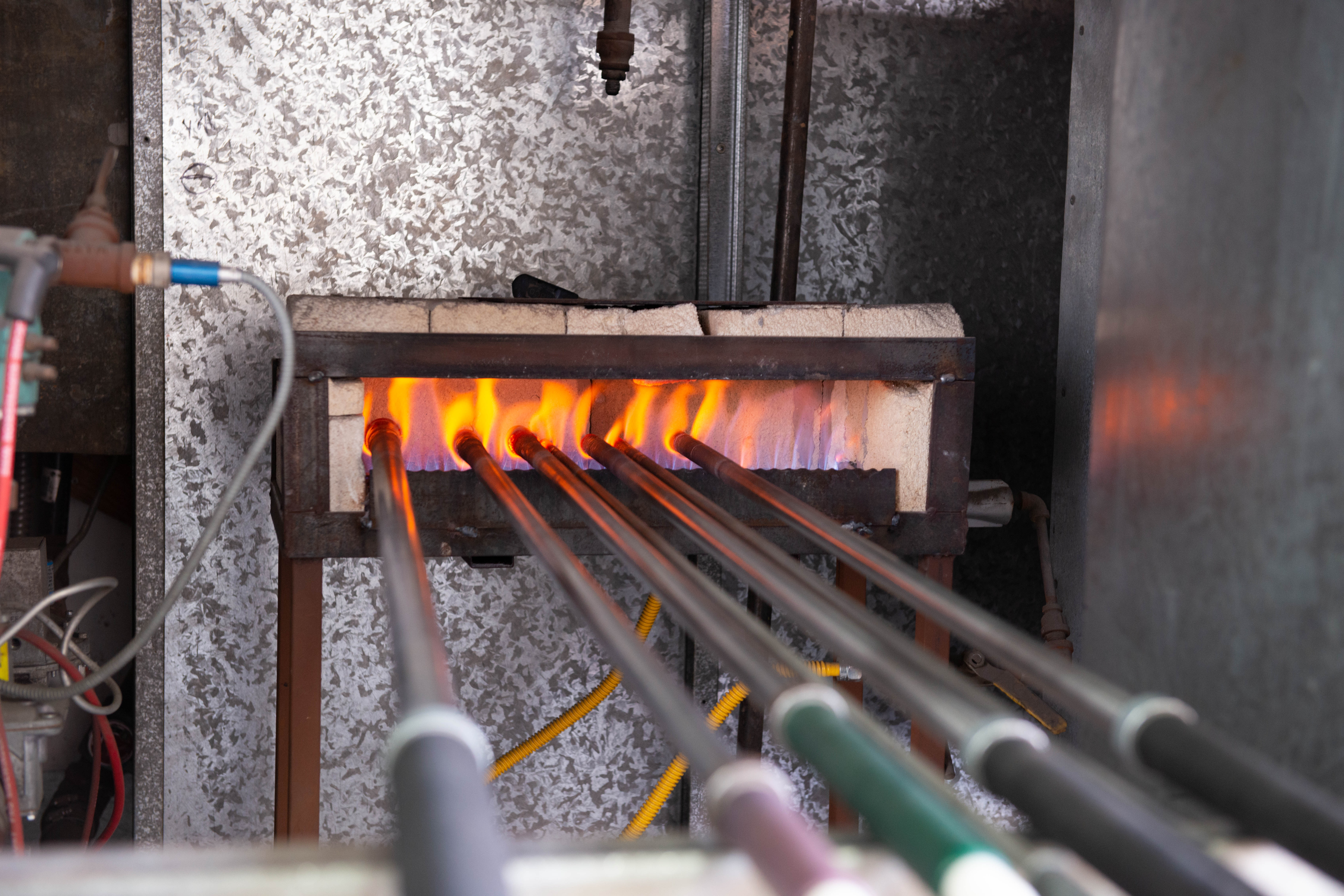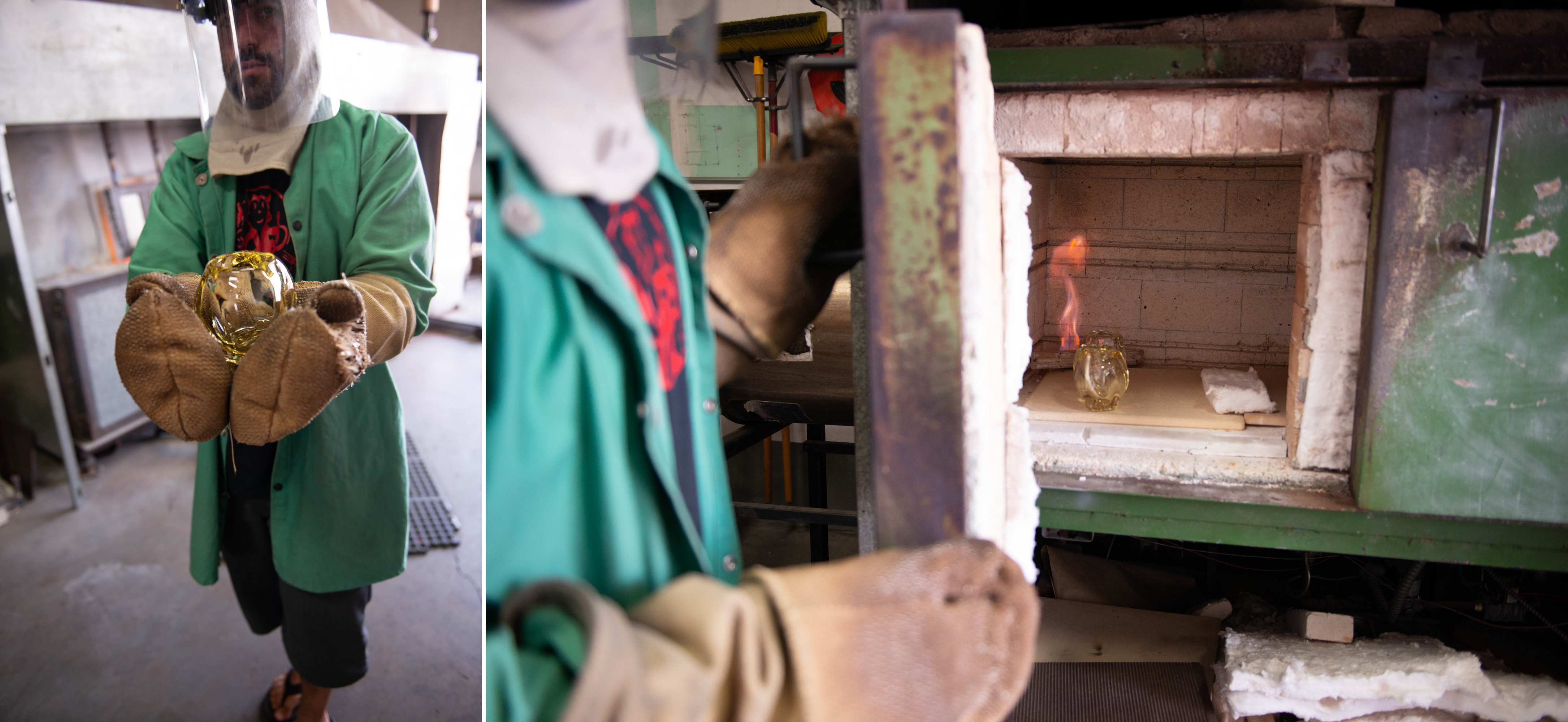 Когда мастер сочтет элемент готовым к завершению, помощник (надев защитные перчатки и куртки, устойчивые к высокой температуре) помещает «Аврору» в печь, где она будет находится несколько часов и медленно охлаждается в течение ночи. Этот процесс называется отжигом; без этого стекло переломилось бы.