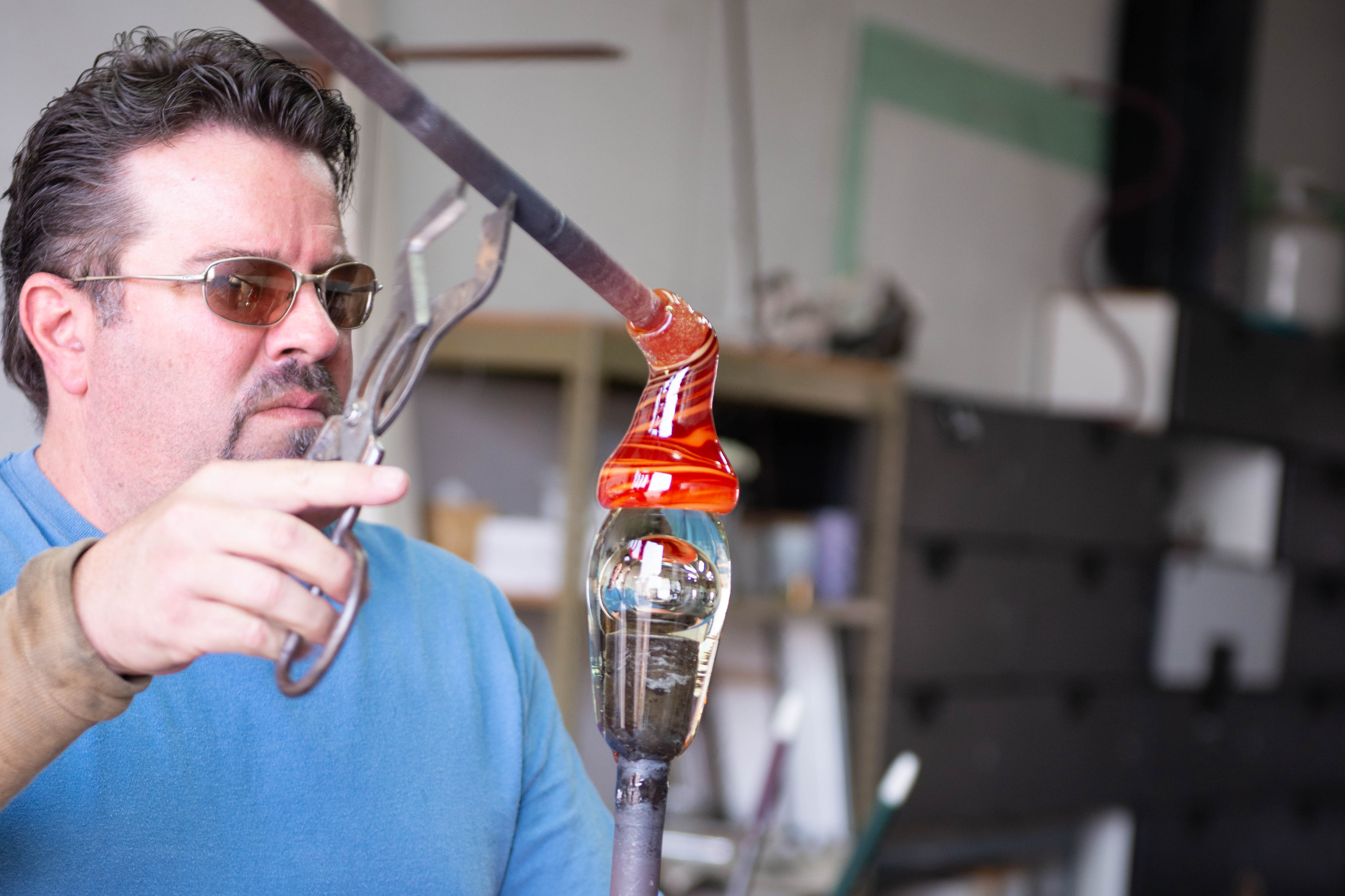Теперь сосуд можно нагреть и сформировать соответствующим образом. В этот момент необходимо проявлять большую осторожность, так как элемент теперь прикрепляется к стержню только очень маленьким соединением. Одно неверное движение, и стекло может разбиться на кусочки об пол студии!