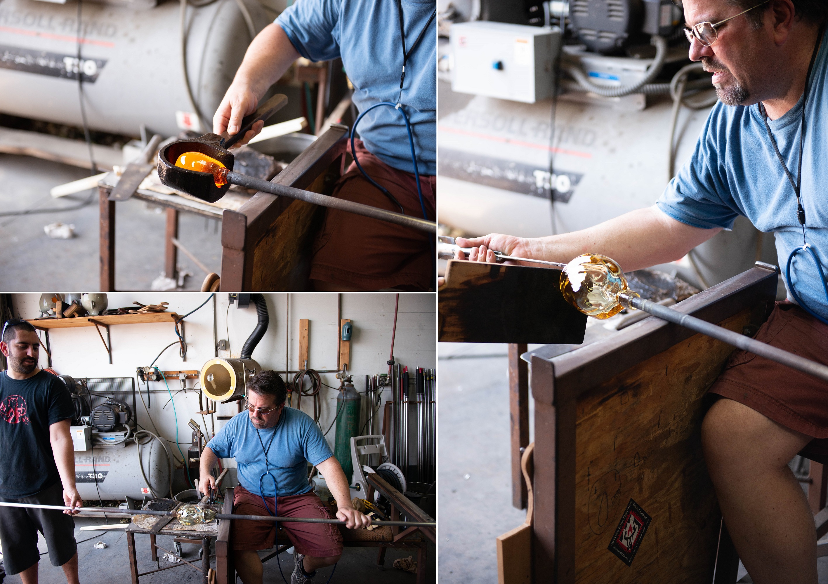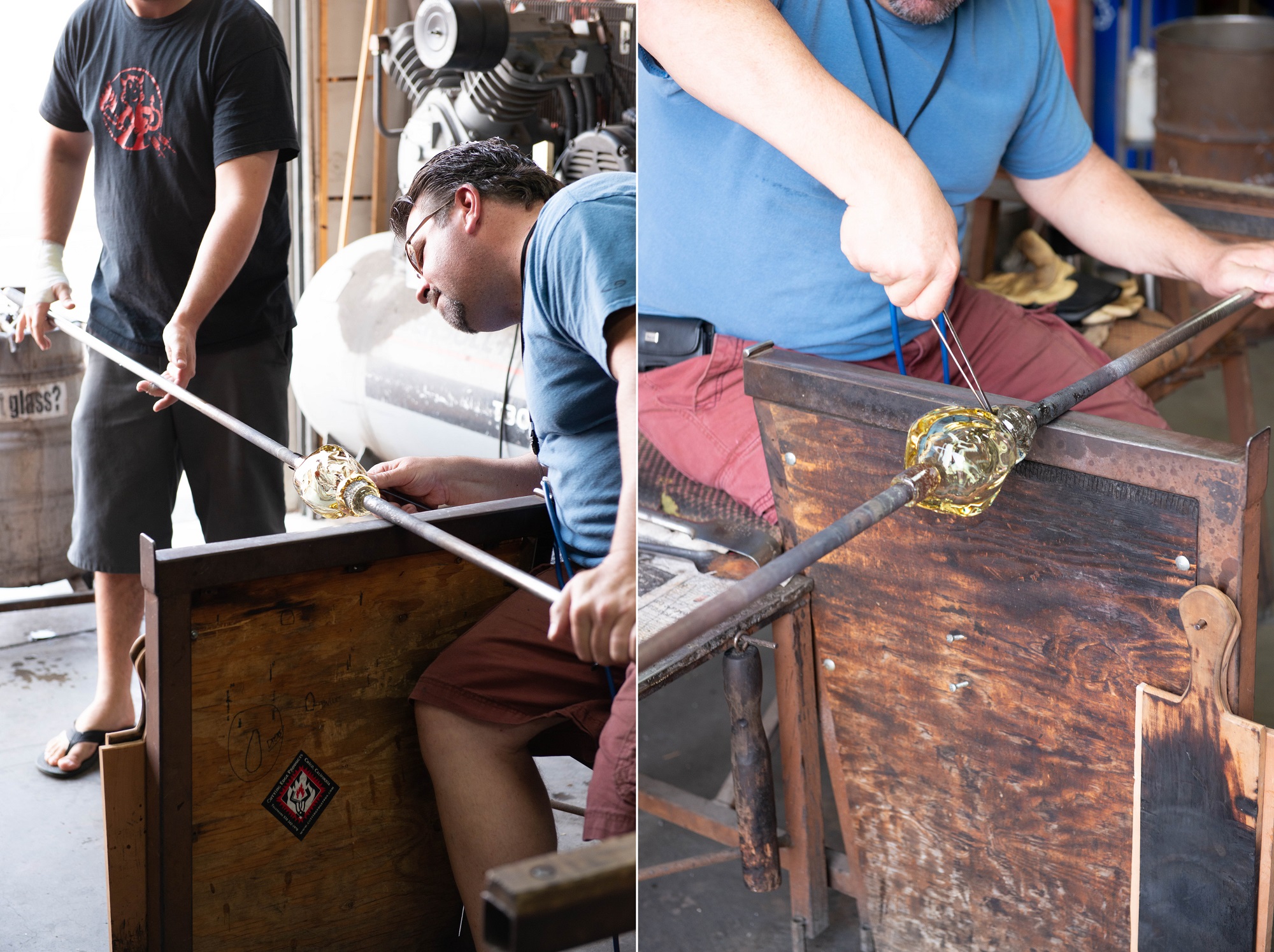 После того, как вы собрали несколько сборок (массы расплавленного стекла, собранные на конце пунти) прозрачного стекла над цветом, можно начать выдувание и формирование. Как только желаемая форма создается на трубе, она переносится на другую пунти. Это позволяет мастеру формировать верхнюю половину или открытый конец стеклянного рассеивателя. Чтобы достичь этого, один из помощников берет небольшую сборку на конце пунти. Вместе с мастером они прикрепляют его к нижней части основного куска стекла, а затем удаляют его из трубы на штангу.