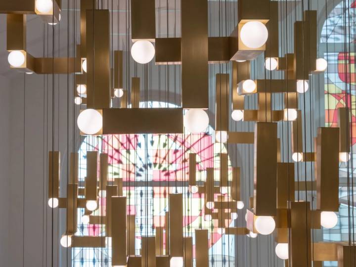 Грандиозная установка экструдированных алюминиевых светильников Vesper занимает следующий зал. Здесь команда Broom`s разработала витражную наклейку, основанную на дизайне середины века, и нанесла ее на окна, а матовые серебристые и золотистые светильники подвешенные спереди, расположены как вертикально, так и горизонтально.