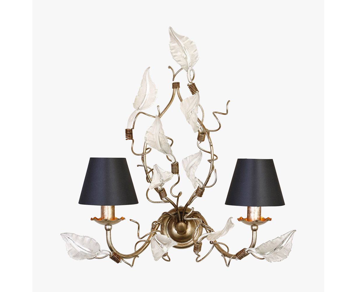 Очень элегантный и внушительный настенный светильник с металлическим каркасом, который красиво украшен современными листьями ручной работы из муранского стекла различных цветов.