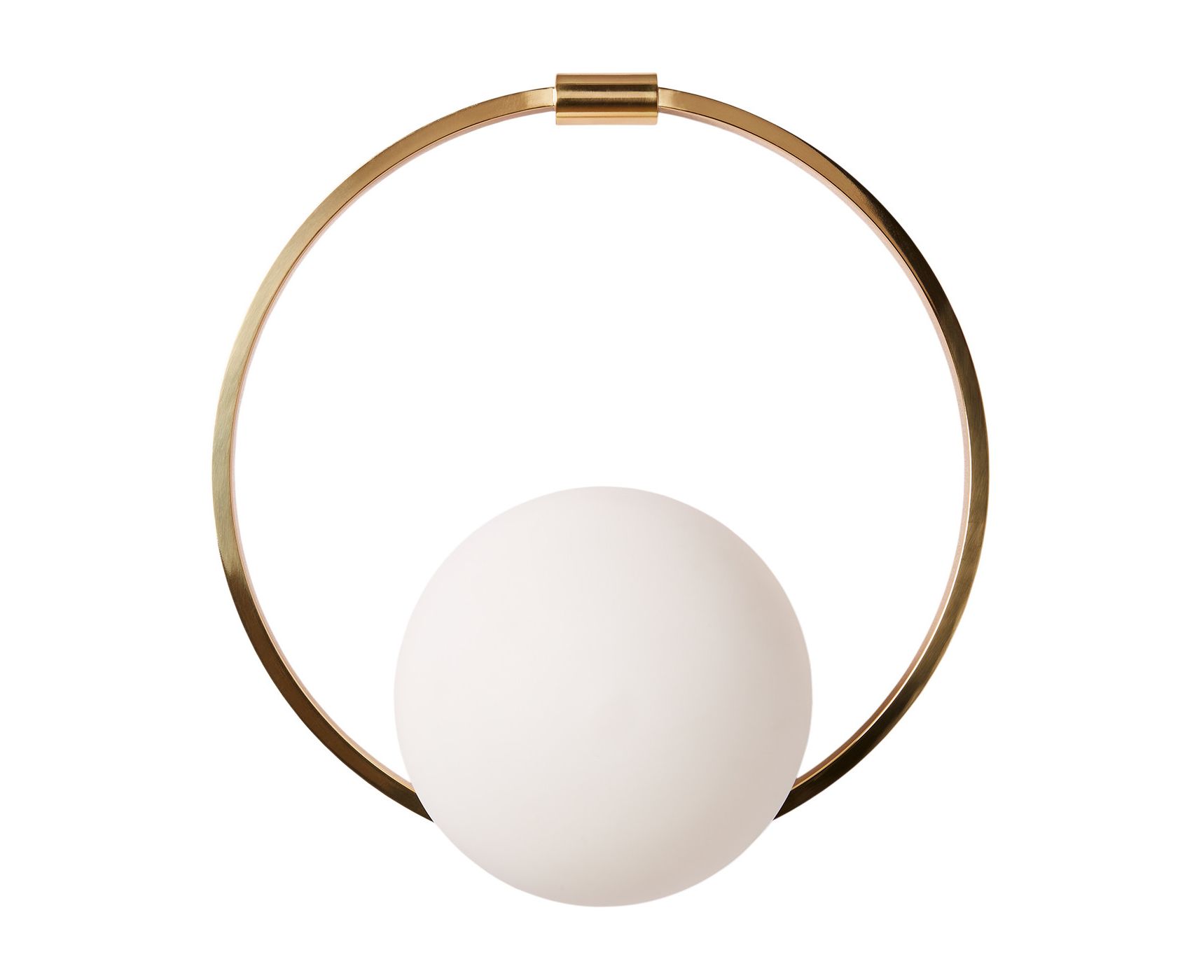Вдохновленный использованием жемчуга в знаковой моде середины века, настенный светильник Veil имеет полушарие из опалового стекла, симметрично обрамленное современным круговым полированным латунным металлическим кольцом.