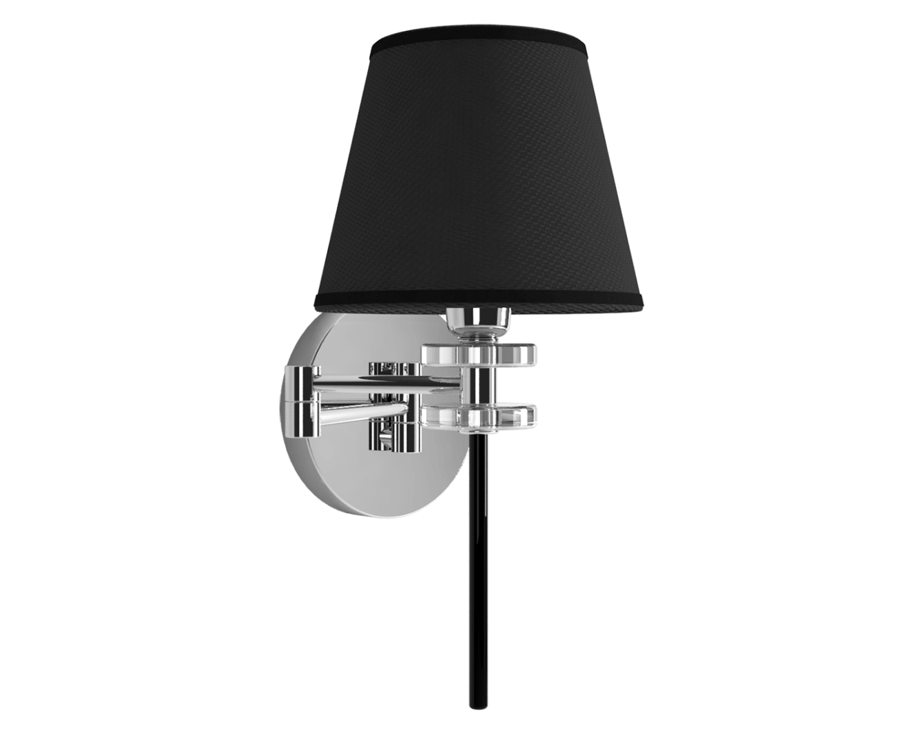 Настенный светильник из металла с хромированной отделкой и стеклянными деталями, черный тканевый абажур. Доступен в разных цветах.