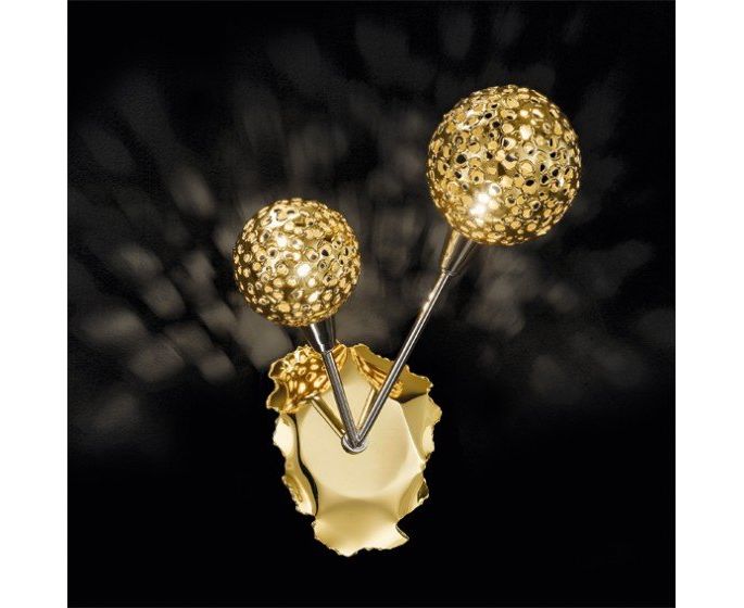Сферы в металле, просверленные отверстиями разных размеров, смешиваются для создания извилистых и непредвиденных линий. Доступный в хромированном и позолоченном виде, коллекция может быть снабжена стеклянными шарами для большей яркости.