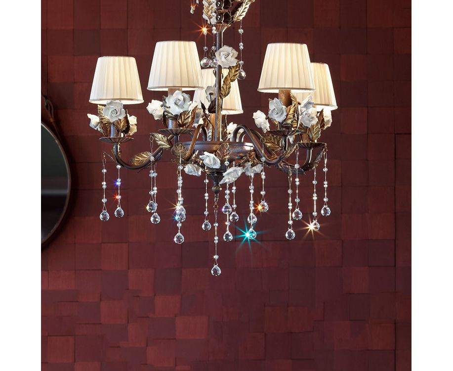 Металлический каркас, окрашенный в оттенки цвета слоновой кости или в светло-коричневый с золотыми мазками, с керамическими розами из Бассано с ручной росписью и абажурами цвета слоновой кости из ткани эпонж.