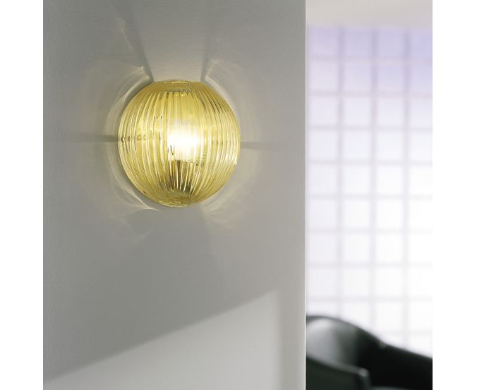Коллекция ламп, доступных в двух размерах. Волнистая поверхность абажура подчеркивает качество стекла, его прозрачность и создает блики на его поверхности, с декором из золотых чешуек.