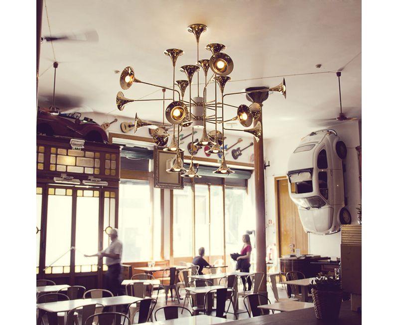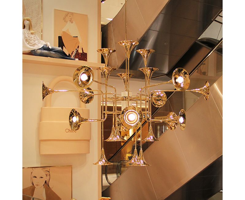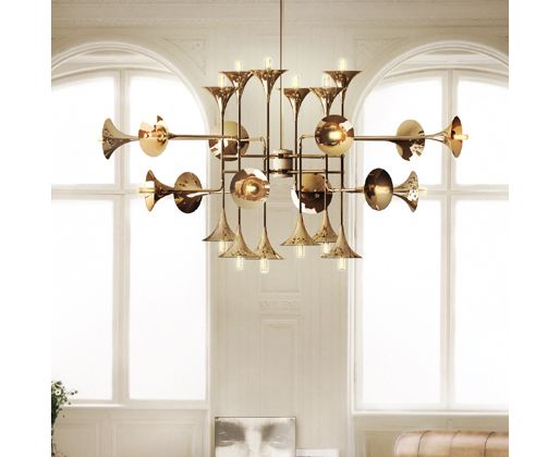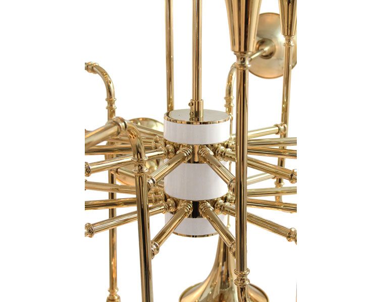 Этот подвесной светильник представляет новую коллекцию Botti. Он воплощает в себе образы духовых инструментов, создавая впечатление будто вы очутились на музыкальном концерте. Структура ручной работы выполнена из латуни и тщательно покрыта золотой отделкой. Этот светильник имеет 24 лампы, которые обеспечивают мягкое освещение, создавая и уютную, и утонченную атмосферу в любом помещении.