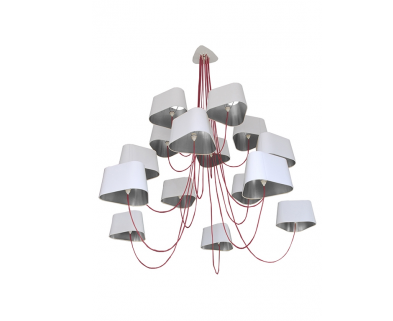 Регулируемая по высоте и ширине люстра. Светильники доступны в 3-х размерах и 3-х моделях, выбор будет зависеть от высоты потолка. Прикрепленные к стальным тросам абажуры могут быть подняты или опущены по необходимости при помощи поршневого механизма, расположенного на самом верху. Регулируемая по высоте эта люстра также регулируется в диаметре и форме в зависимости от размещения абажуров. Расположенные под абажурами цветные текстильные корды также служат в качестве декоративных элементов.