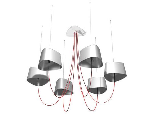 Регулируемая по высоте и ширине люстра. Светильники доступны в 3-х размерах и 3-х моделях, выбор будет зависеть от высоты потолка. Прикрепленные к стальным тросам абажуры могут быть подняты или опущены по необходимости при помощи поршневого механизма, расположенного на самом верху. Регулируемая по высоте эта люстра также регулируется в диаметре и форме в зависимости от размещения абажуров. Расположенные под абажурами цветные текстильные корды также служат в качестве декоративных элементов.