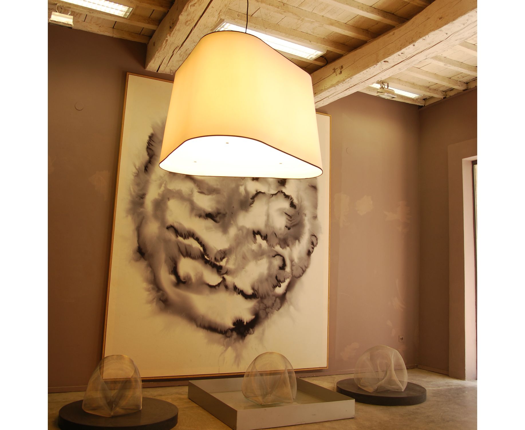 Для комфортного распределения света этот очень большой подвесной светильник оснащен нижним диффузором из атласного опаловго акрилового стекла.