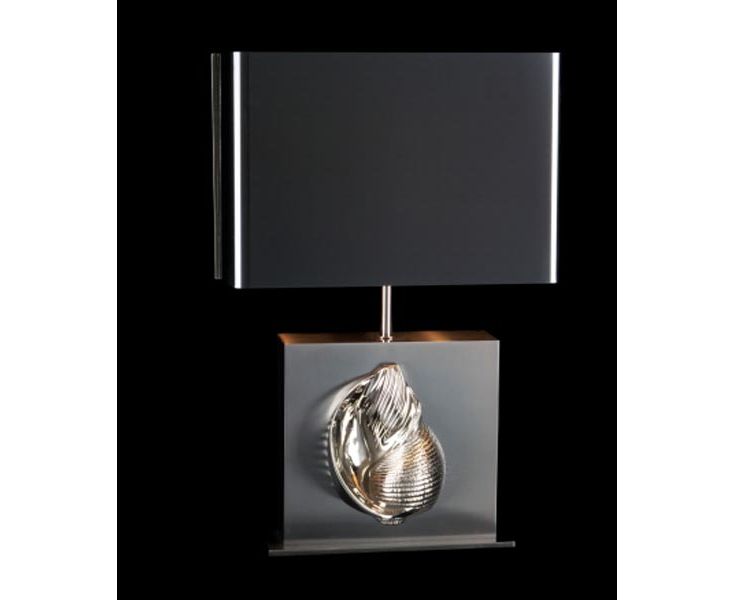 По форме светильник напоминает квадрат, достаточно большой абажур и ракушка прикреплена в основании. Отделка из никеля и темного никеля.