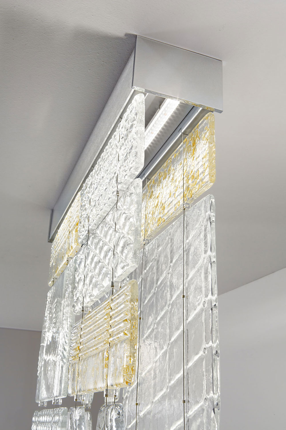 Большое внимание было уделено производству стеклянных панелей, которые изготавливаются вручную мастерами-стеклодувами, из расплавленного стекла, которое формуется и образует множество конструкций. Коллекция состоит из подвесных светильников, модульных потолочных и настенных светильниках в различных размерах для внутреннего использования с металлической структурой.