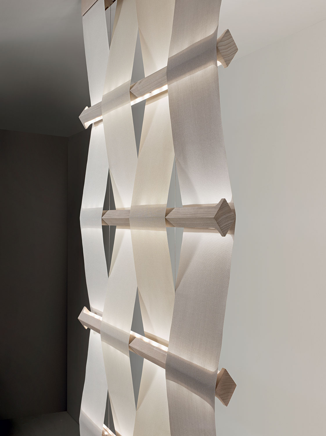 Благодаря своим техническим и эстетическим характеристикам Metropole идеально подходит для освещения больших пространств, таких как лобби в отеле или для ресторанов с открытым пространством. Эта модульная система включает в себя натуральные планки из буковой древесины, чередующиеся с звукоизоляционной и огнестойкой тканью. В платах содержится светодиодный источник света, который может быть двух- или однонаправленным, в зависимости от световых эффектов, которые вы хотите создать. Ткань крепится к потолочной планке, которая удерживает драйвер, закрепленный чередующимся образом на ткани.