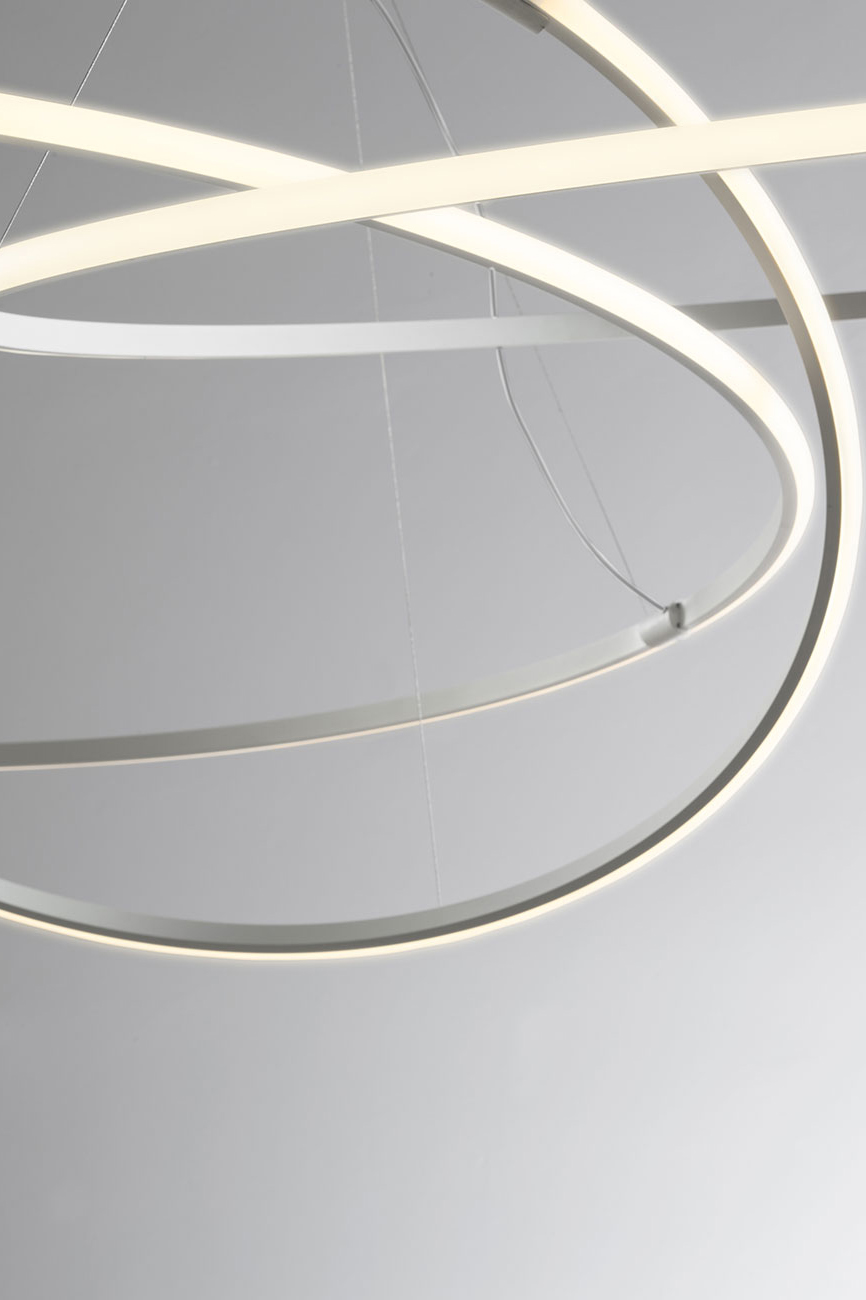 Olympic - это алюминиевая подвесная световая коллекция из белого алюминия с подсветкой из светодиодного источника света, расположенном на наружном кольце. Прямая и косвенная диффузия света. Подвесные светильники доступны в разных диаметрах и в одном или нескольких исполнениях. Особенность этих ламп - возможность переплетать их, при этом есть возможность повесить из на расстоянии друг от друга, создавая оригинальные формы и композиции, также благодаря простой регулировке длины кабеля.