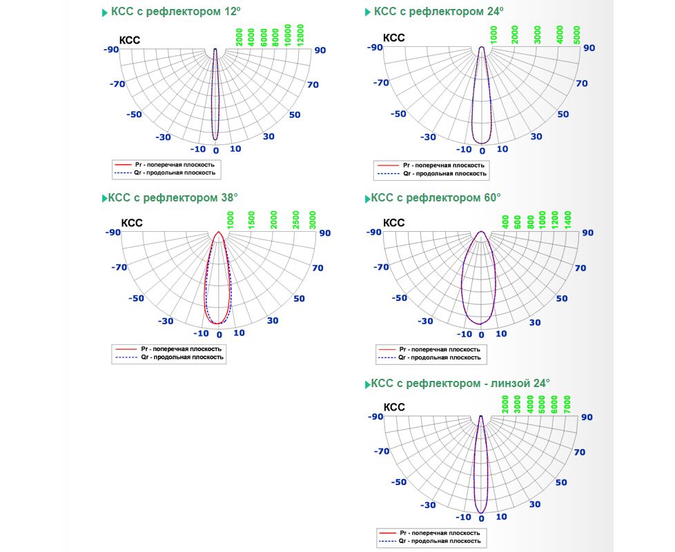 Есть возможность выбора рефлектора (рассеивателя), что позволяет создать угол основного света 12°, 24°, 38° или 60°