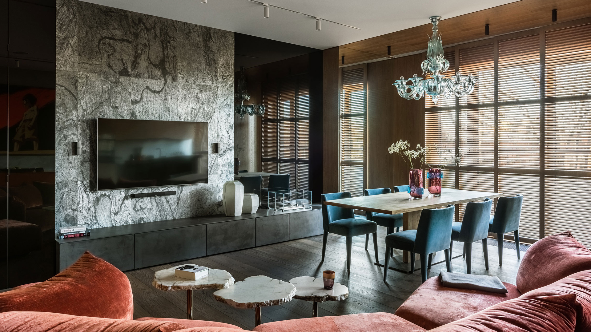 Проект внутренней отделки этой квартиры площадью более 200 квадратных метров в Санкт-Петербурге призван создать гостеприимную, расслабляющую атмосферу и внести определенный естественный тон в домашнее пространство. Мебель, аксессуары, шторы и осветительные приборы были тщательно отобраны и расставлены. Особенно удачным выбором является люстра Domo Nevada над длинным обеденным столом.