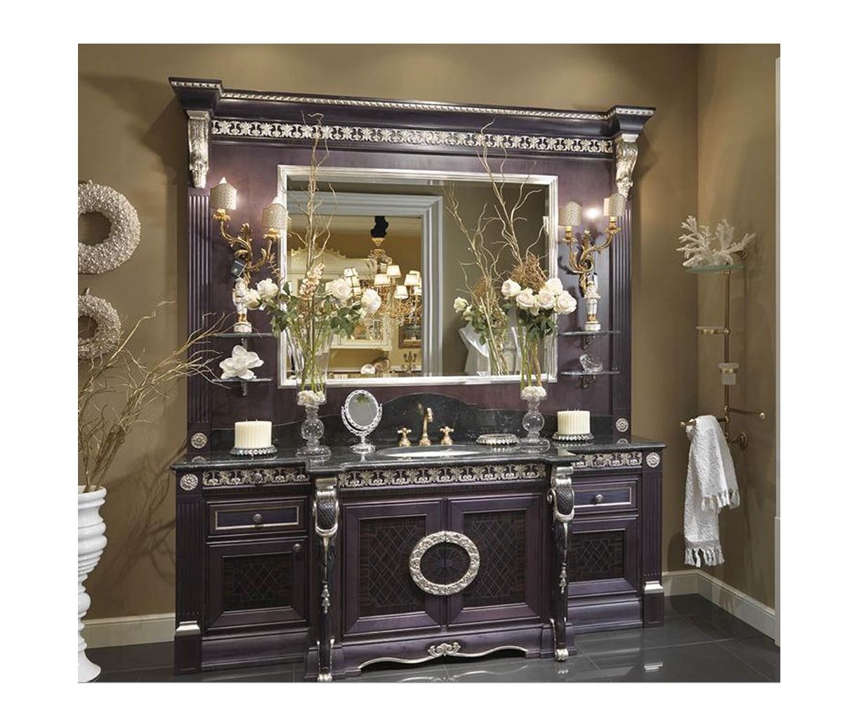 Мебельный гарнитур для ванной в классическом стиле. Тумбочка с несколькими шкафчиками и выдвижными ящиками, столешница выполнена из мрамора. Все оформлено в едином стиле, гармонично и красиво. В гарнитур входят: тумба под раковину, зеркало, шкаф.