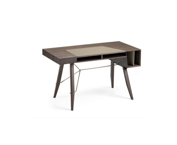 Письменный стол с четкими линейными формами. Металлическая вставка, которая пересекает основание, придает столу современный вид и винтажный стиль. Вместительные ящики и ниши дают возможность использовать стол для комфортной работы.