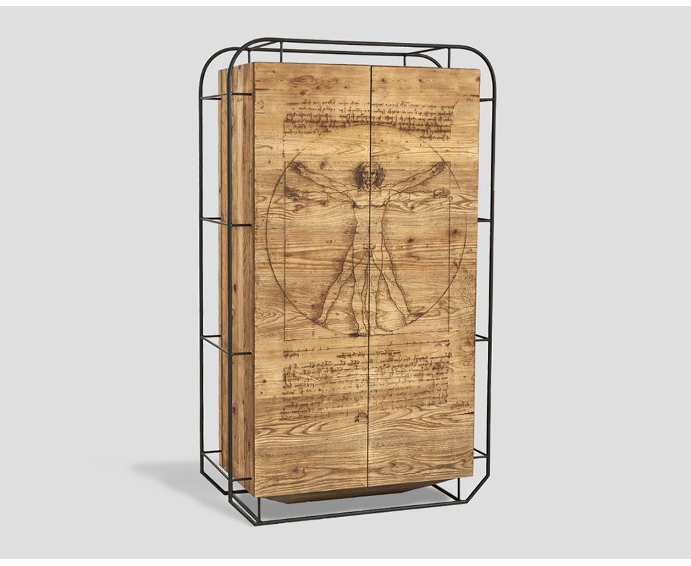 Armadio 2 ante in legno vecchio riciclato con incisione artistica a fuoco e telaio esterno in metallo brunito.