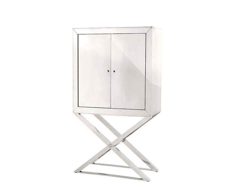 Шкаф-бар из нержавеющей стали. Модель выполнена в современном минималистичном стиле. Шкафчик размещена на ножках в форме буквы "Х", поэтому модель устойчива. За распашными дверцами две стеклянных полки и зеркальная отделка. Легко вместятся несколько бутылок и стаканов.