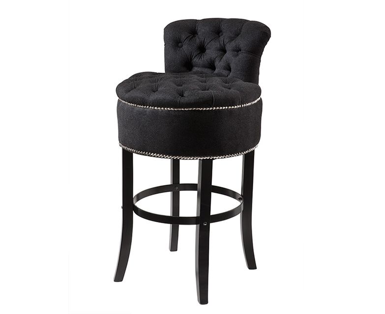 Барный стул в классическом стиле. Широкое круглое сиденье - мягкое и удобное. Оно декорировано мебельными гвоздиками контрастного цвета. Стул с невысокой спинкой, чтобы сделать модель еще более комфортной. Тонкие деревянные ножки с перекладиной для ног. Барный стул украшен стежкой капитоне, сзади декоративная ручка.