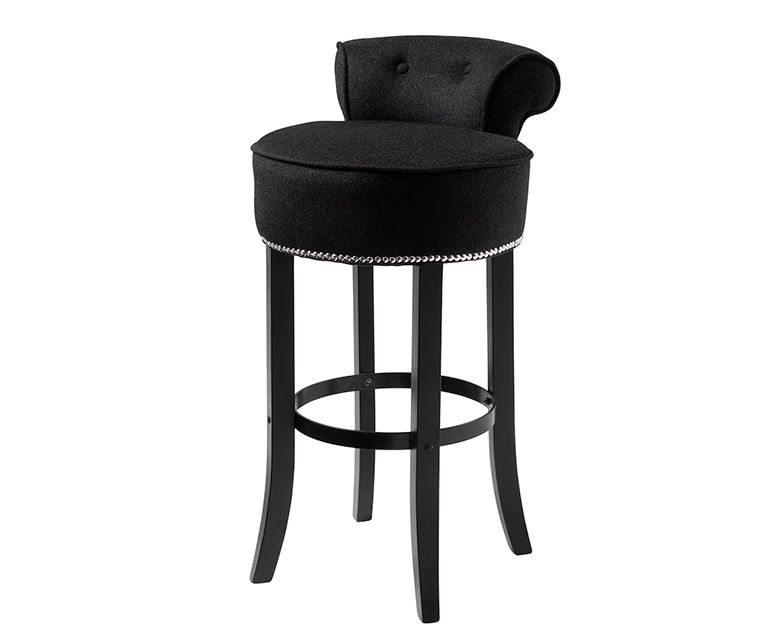 Барный стул для кухни или бара. Классическая круглая форма сиденья. Есть небольшая спинка-завиток, украшенная двумя мебельными пуговицами. Модель декорирована мебельными гвоздиками и кантом. Высокие тонкие ножки с перекладиной для ног.