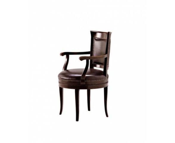 Удобный стул с подлокотниками в классическом стиле. Модель изготовлена из массива вишни и доступна в обивке из текстиля или кожи. Выгнутая спинка с мягкой втавкой по середине. Стул украшен мебельными кнопками. Круглое мягкое сиденье.