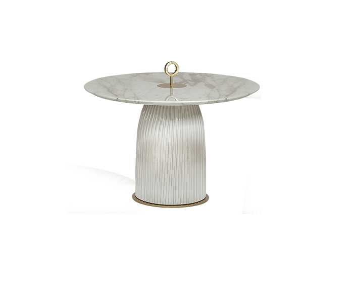 Скульптурные журнальные столики, в которых по разным формам сочетаются благородные материалы, такие как мрамор, металлическая гальваническая отделка и керамика ручной работы, тонко обработанные вручную во Вьетри.