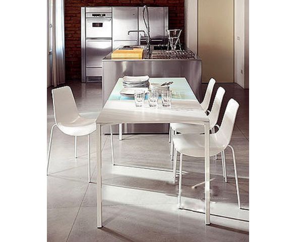 Универсальный стол Fli с боковыми расширениями. Каркас выполнен из окрашенной или хромированной стали. Столешница и расширения доступны из стеклянной пластины или из ламината Doluflex.