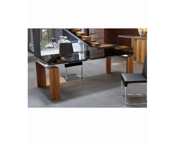 Раскладной стол James с боковыми расширениями. Деревянный каркас и стеклянная столешница доступны в различных отделках.