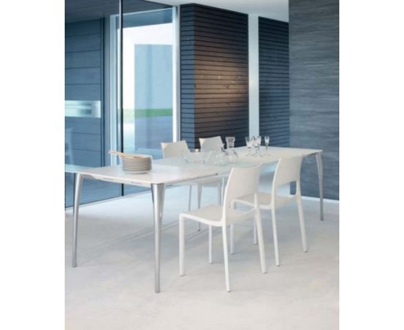 Стол с цельной столешницей. Ножки сделаны из литого алюминия, столешница может быть окрашена в разные цвета и выполнена из стекла или doluflex. Минималистский объем стола и столешницы создают приятный эффект легкости и динамичности.