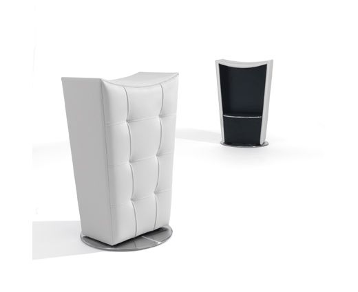 Вращающийся барный стул с основанием из сатинированной нержавеющей стали, внутренняя часть глянцевого черного цвета. Обивка из мягкой или синтетической кожи.