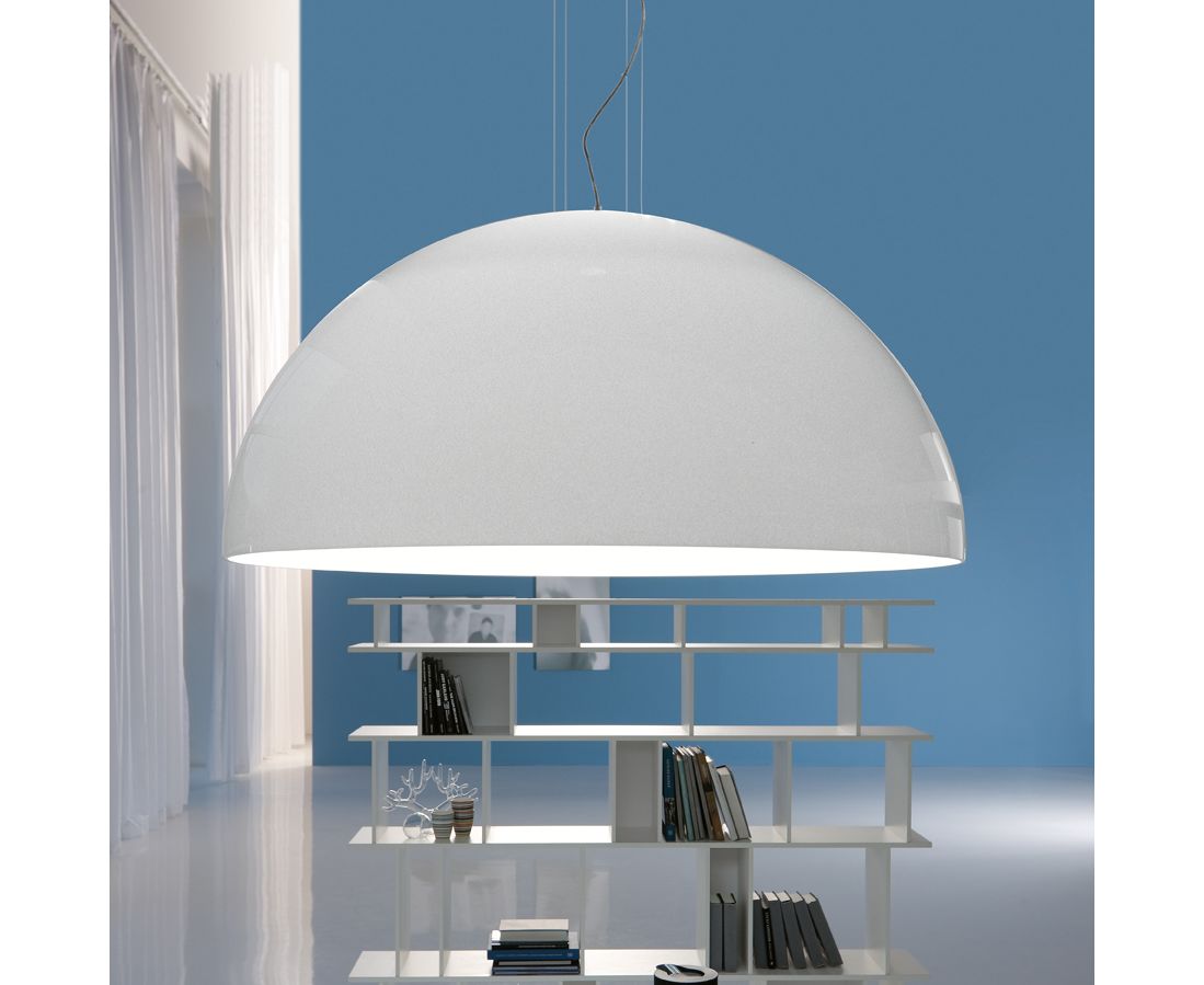 Потолочный подвесной светильник с абажуром из белого, черного или блестящего серебряного метакрилата.