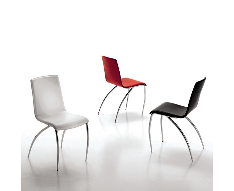 Стул без подлокотников с простым дизайном, удобный и практичный. Оригинальные ножки. Стул с хромированным или матовым серебристым стальным каркасом. Сиденье и спинка обиты кожей. Швы стандартные.
