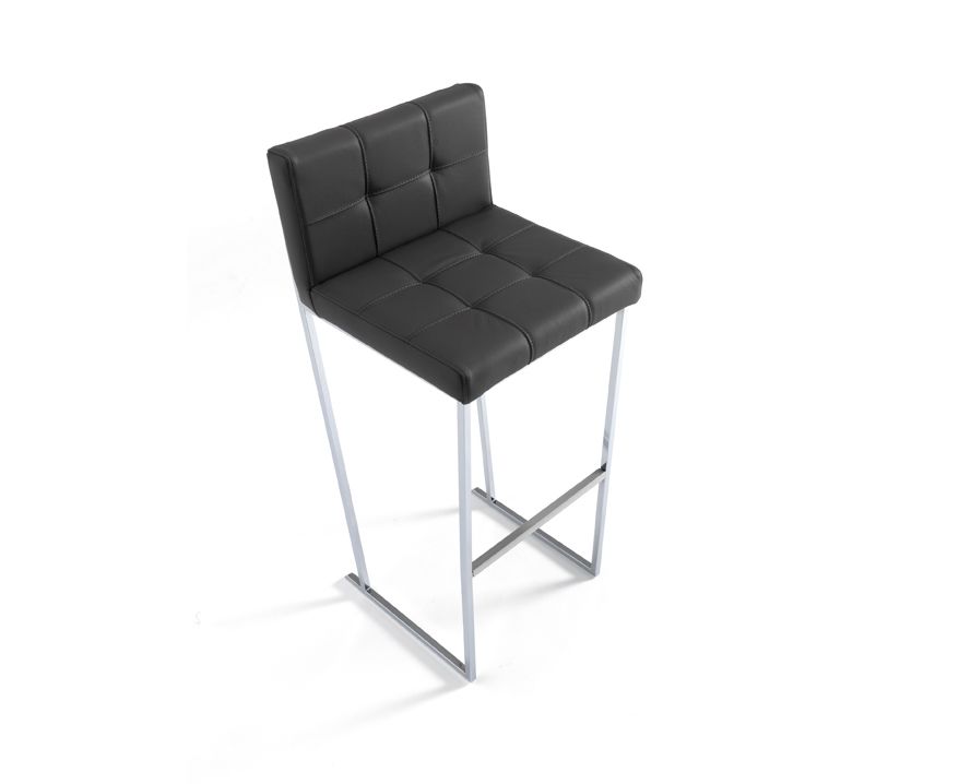Стул барный. Имеется подставка для ног. Мягкая спинка. Колекция KATE включает модели без или с подлокотниками, а также широкий стул без подлокотников. Основание сделано из хромированной стали. Сиденье и спинка обиты мягкой или синтетической кожей, декорированы стежкой капитоне.