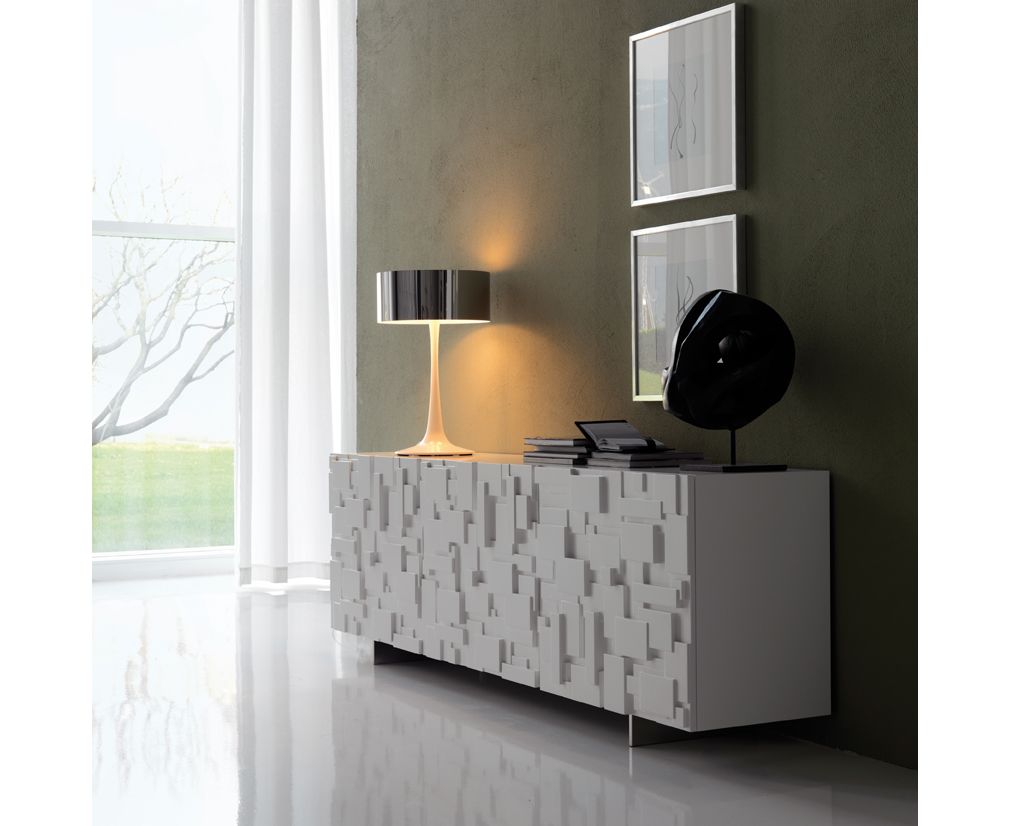 Деревянный комод с дверцами из матового белого или цвета графит полиуретана. Ножки сделаны из нержавеющей стали или окрашенные в матовый белый/ графитовый цвет. Внутренние полки выполнены из прозрачного стекла. У модели с тремя дверями имеется внутренний ящик.