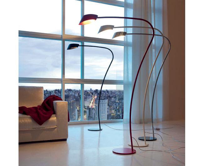 Торшер с основанием из хромированной или окрашенной в белый, черный или красный цвет стали и абажуром из белой, черной или красной ткани.