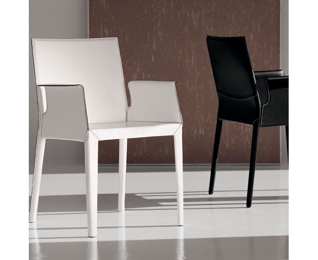 Стул с подлокотниками. Коллекция MARGOT включает в себя 4 модели: стул с подлокотниками и невысокой спинкой, три модели стульев без подлокотников, различающихся шириной или высотой спинки. Мягкая спинка у всех моделей слегка отклонена назад. Стальной каркас полностью скрыт за кожаной обивкой.