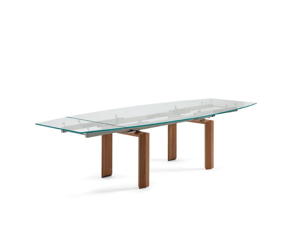 Раздвижной стол с основанием из нержавеющей стали, ореха Canaletto, венге или в матовом белом лаке. Столешница и раздвижные части сделаны из прозрачного стекла, сверхпрозрачного стекла или сверхпрозрачного окрашенного белого стекла толщиной 12 мм.