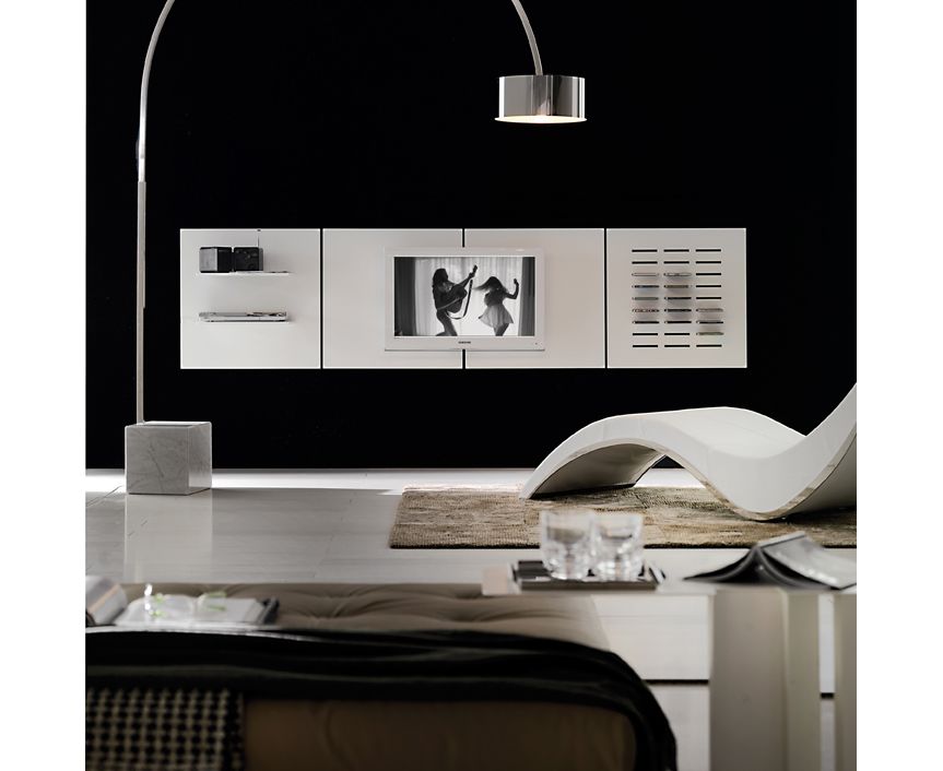 Книжный шкаф MOSAICO Luigi Trenti фабрики Cattelan Italia - настенная система. Модули в белом лаке, гофрированные или с зеркалом. Подставка для ТВ.