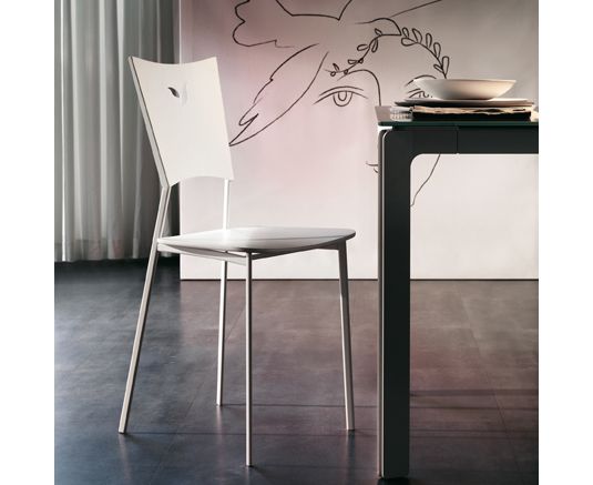 Удобный простой стул с каркасом и спинкой из окрашенной стали различных цветов на выбор из каталога фабрики. Сидение выполнено из лакированного МДФ в цветe основания. Спинка украшена сквозным незамысловатым рисунком.